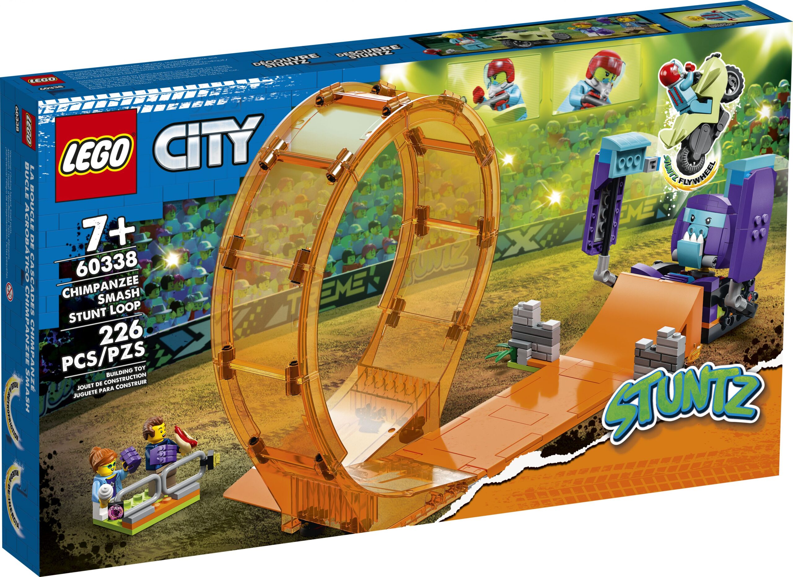 Das LEGO Set Schimpansen-Stuntlooping mit der LEGO-Nummer 60338 Smashing Chimpanzee Stunt Loop gehört zur Themenreihe LEGO CITY. Altersempfehlung: 7+ Jahre. Dieser LEGO Baukasten ist 2022 erschienen und ist seit Ende Dezember 2023 offiziell aus dem LEGO-Programm (EOL = End of Life). Das Set enthält 3 Minifiguren, von denen 3 exklusiv nur in diesem Set enthalten sind. Das Modell besteht aus 226 Teilen. Die Bauzeit beträgt weniger als eine Stunde. Die Teile des Sets ohne Anleitung und Box wiegen ca. 350 Gramm. Die LEGO-Box wiegt insgesamt ca. 624 Gramm.