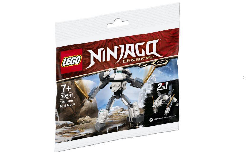 Das LEGO Set Mini-Titan-Mech mit der LEGO-Nummer 30591 Titanium Mini Mech gehört zur Themenreihe LEGO NINJAGO. Altersempfehlung: 7+ Jahre. Dieser LEGO Baukasten ist 2021 erschienen und ist seit Ende Dezember 2021 offiziell aus dem LEGO-Programm (EOL = End of Life). Das Modell besteht aus 77 Teilen. Die Teile des Sets ohne Anleitung und Box wiegen ca. 37 Gramm. Die LEGO-Box wiegt insgesamt ca. 43 Gramm.